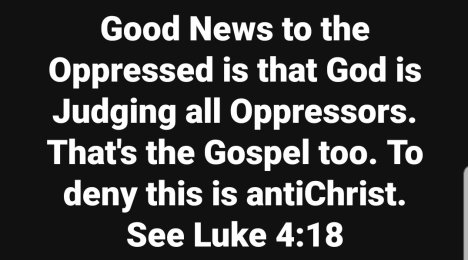 Good News to the Oppressed is that God is Judging all Oppressors. That’s the Gospel too. To deny this is antiChrist.