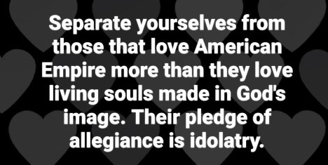 Separate yourselves from those that love American Empire more than they love living souls made in God’s image. Their pledge of allegiance is idolatry.