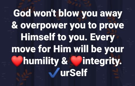 God won’t blow you away & overpower you to prove Himself to you. Every move you make for Him will be your own heart ❤humility & heart ❤integrity.