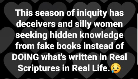 This season of iniquity has deceivers and silly women seeking hidden knowledge from fake books instead of DOING what’s written in Real Scriptures in Real Life.😢