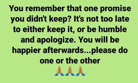 You remember that one promise you didn’t keep? It’s not too late to either keep it, or be humble and apologize. You will be happier afterwards…please do one or the other