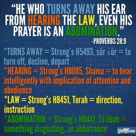 Proverbs 28:9 He that turneth away his ear from HEARING THE LAW, even his PRAYER SHALL be ABOMINATION.