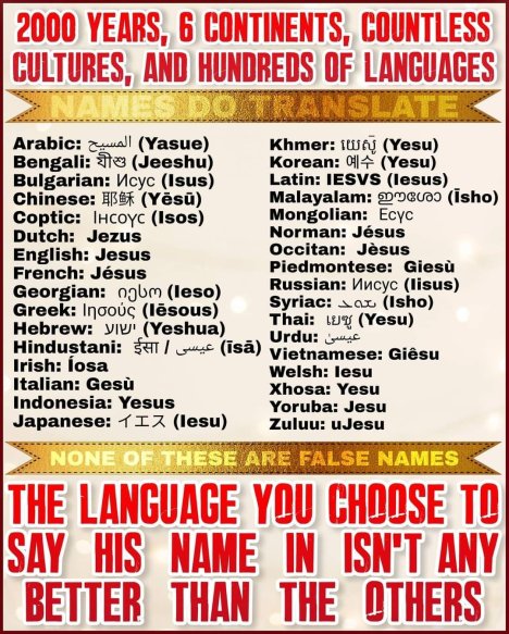 You can call Him Jesus or Yehusha or Emmanuel or Yahshua or Yeshua or Jesus’ Christos.