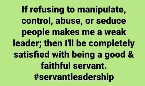 If refusing to manipulate, control, abuse, or seduce people makes me a weak leader; then I’ll be completely satisfied with being a good & faithful servant. #servantleadership